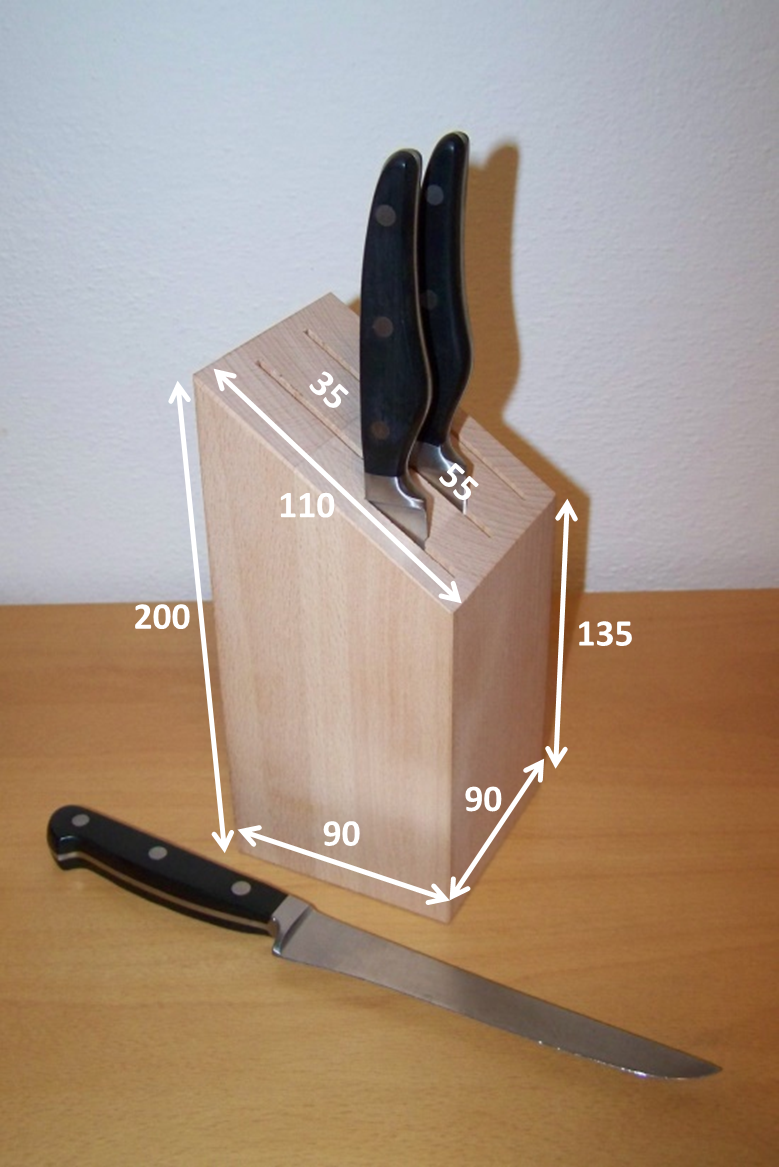 blok je zhotovený z bukového dřeva vhodný pro uložení 5 ks nožů rozměry bloku jsou zobrazeny na obrázku vyrobeno v ČR