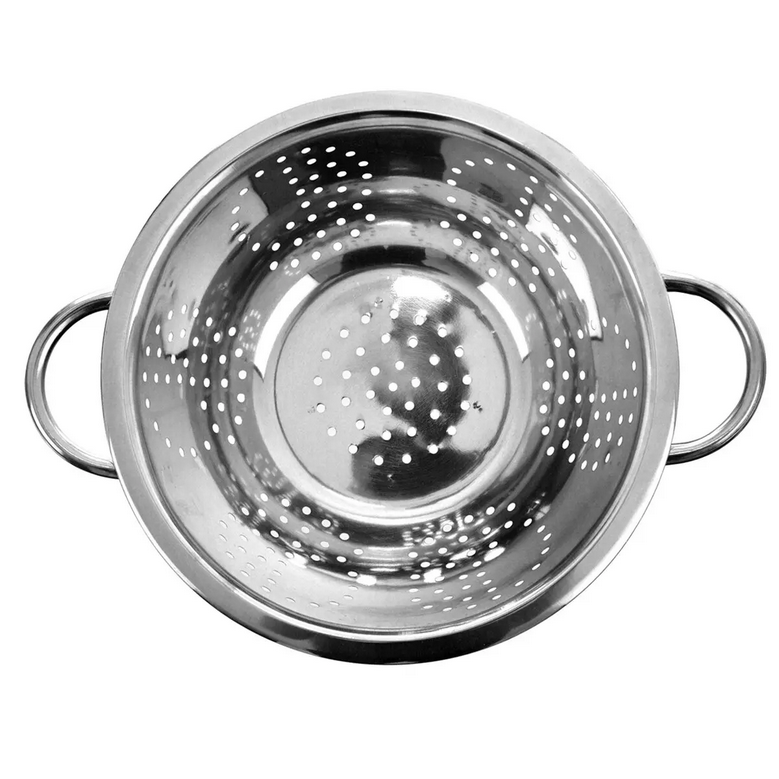 Cedník nerezový - mísa, vhodný jak pro cezení, tak pro následné servírování. Šířku uvádíme včetně obou úchytů. Rozměry: pr. 28 cm, š. 34 cm, v. 12,5 cm.
