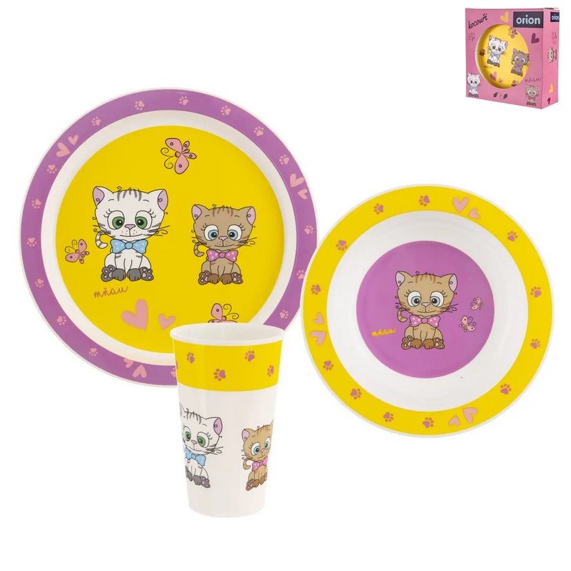 Jídelní sada s dětským dekorem obsahuje pohárek, hlubokou misku a mělký talířek. Materiál: kvalitní plast PP. Použití při teplotách od -20 °C do +95°C. Rozměry: pohár pr. 7 cm, v. 11 cm, o. 280 ml, miska pr. 16 cm, v. 3,5 cm, o. 350 ml, talířek pr. 21,5 cm, v. 1,5 cm. Lze mýt v myčce nádobí (60 cyklů), je možné použití v MVT. Pro děti od 3 let.