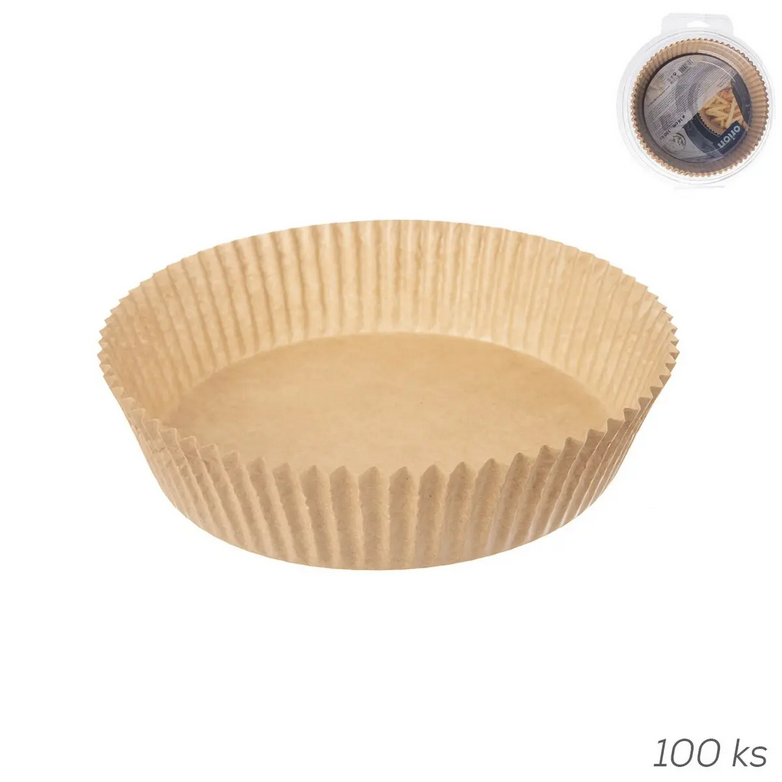 Kulatá papírová forma chrání koš horkovzdušné fritézy před zbytky jídla, olejovými skvrnami a škrábanci. Hodí se také do klasické trouby, MVT, do pánve, koláčových a dortových forem, na grilovací desku, do parního hrnce. Je určena pro teploty až do +220 °C. Je vodotěsná, nepřilnavá, nepropouští olej. Sada 100 ks. Materiál: silikonový olejový papír (vyrobený z dřevěné buničiny a silikonového oleje). Rozměry: pr. 16 cm (dno), v. 4,5 cm.