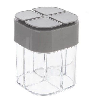 Materiál: plast PP (víčko), PS (tělo kořenky). Rozměry: 6,5x6,5x8,3 cm. Objem jednotlivých sekcí 55 ml. Lze mýt v myčce.