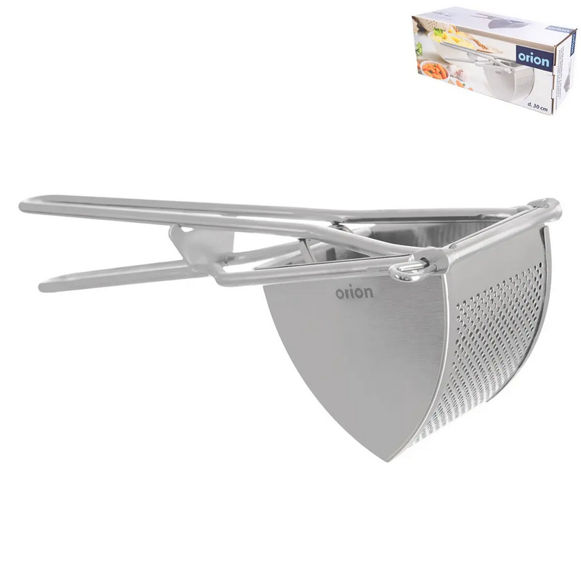 Nerezový lis na brambory pro lisování vařených brambor. Materiál: masivní kvalitní nerez. Rozměry: d. 30 cm, š. 9,5 cm, celková délka spojovací osy š. 12 cm, pr. otvorů 2 mm. Snadná údržba - možnost snadného rozložení a mytí v myčce.