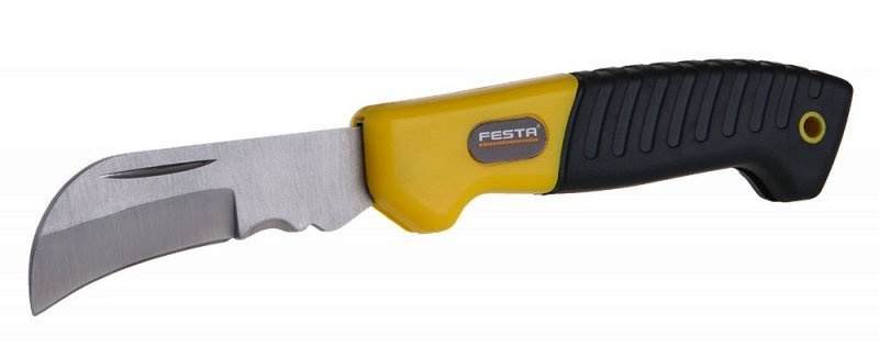 Zavírací elektrikářský nůž se zahnutou čepelí, silná čepel se dvojím ostřím usnadňujícím odizolovávání vodičů, pogumovaná ergonomická rukojeť