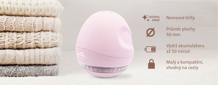 Odžmolkovač ETA Mia je vybaven nerezovými břity bezpečně skrytými za pracovní plochou o průměru 50 mm. Jeho sestavení, ovládání i údržba jsou velmi snadné. Akumulátor nabízí až 50 minut provozu na jedno nabití, které pomocí přiloženého USB-C kabelu trvá pouhé 3 hodiny. Nabíjení i provoz jsou přitom doprovázeny rozdílnou světelnou signalizací. Přebytečné žmolky, nitky a smítka putují přímo do průhledného zásobníku, který lze jednoduše odejmout a vyprázdnit. S důkladnější očistou břitů pomůže kartáček, který je součástí balení.
