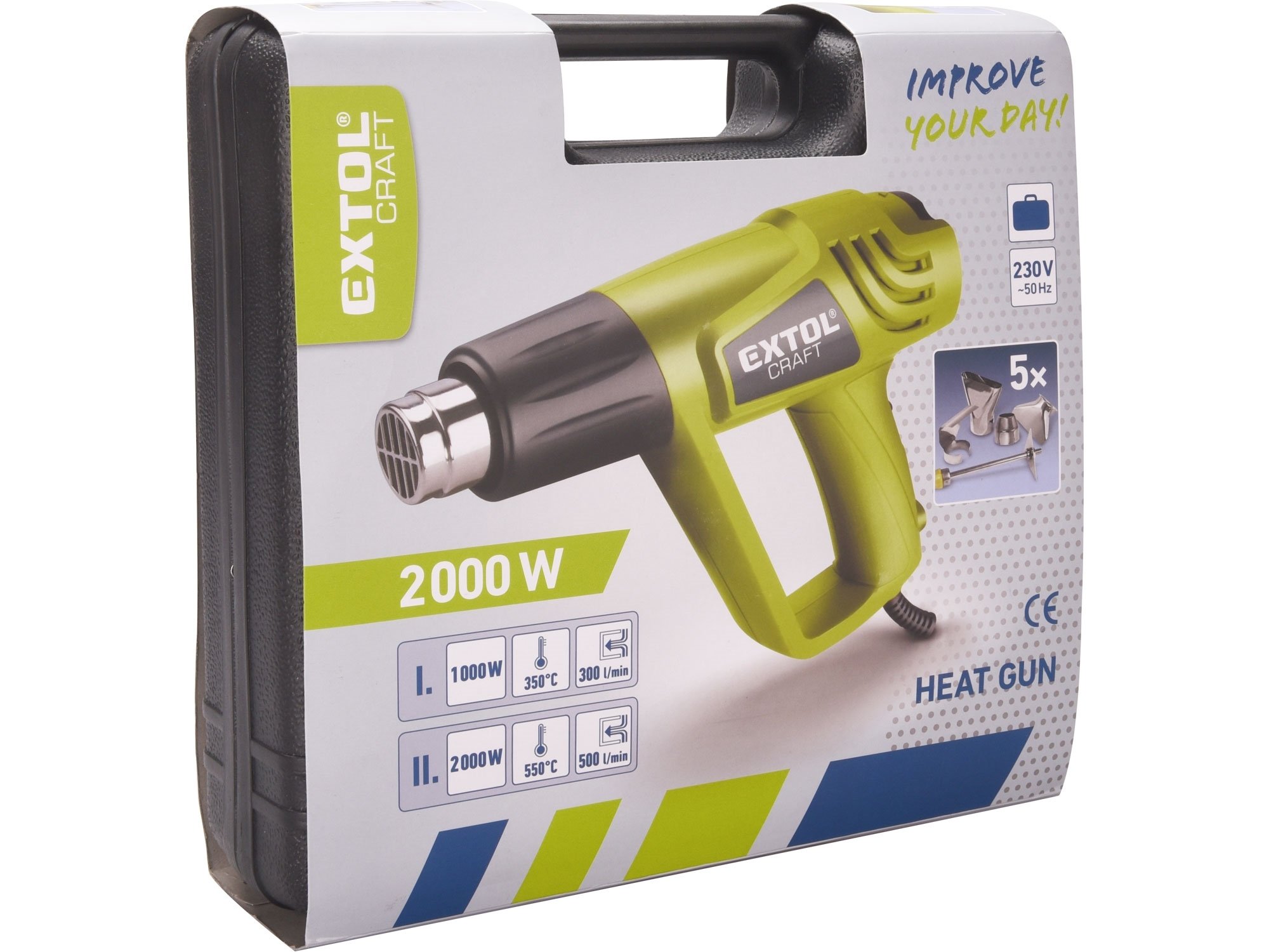 TECHNICKÉ PARAMETRY napětí/frekvence: 230V/50Hz příkon: 2000/1000W teplota: 550/350°C proud vzduchu: 500/300l/min hmotnost: 0,7kg Pistole je dodávána v pevném plastovém kufru s 5 ks sadou nástavců