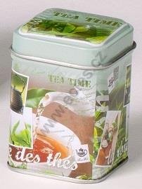 čtveratá plechová krabička čajovka vhodná na 25 g sypaného čaje rozměr: 44x44x64 mm