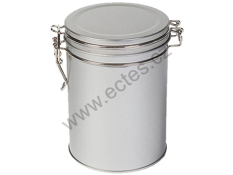 vyšší kulatá patentní plechová krabička ideální na 200 g sypanného čaje, kávy i jiné potraviny pevné plechové aroma víčko s klipovým uzávěrem pro snadné otevírání rozměr: 95x130 mm