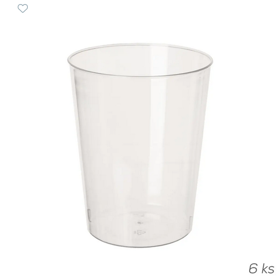 Sada 6 ks. Opakované použití. Pokud se rozbije, nemusíte řešit ostré střepy a nebezpečí pořezání. Materiál: plast PP. Rozměry: o. 280 ml, pr. 7,3 cm, v. 9,5 cm. Vhodný do myčky. Max 70 °C.