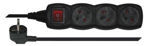 Prodlužovací kabel se 3 zásuvkami. Délka prodlužovacího kabelu je 1,5 m a má vypínač. Prodlužovací kabel má všestranné využití, především v dílně a garáži díky své černé barvě.
