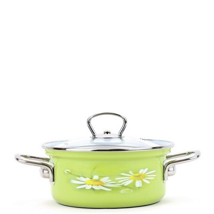 Řada Daisy se vyznačuje zejména nerezovým kováním a skleněnou poklicí. Oživí každou domácnost svěžími barvami a nápaditým dekorem. Modro-šedý granit uvnitř tohoto nádobí je tím nejodolnějším smaltem. Tato řada se stala jednou z našich nejpopulárnějších řad. PARAMETRY: řada Daisy typ rendlík poklice skleněná materiál smaltovaný ocelový plech síla plechu 1,0 mm vnější smalt zelený vnitřní smalt šedo-modrý ROZMĚR: O nádoby 16 cm O s okrajem 18,5 cm max rozměr s uchy 23 cm O dna 14 cm výška 8 cm objem 1,4 l