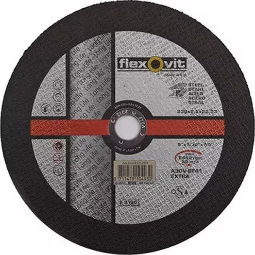 Řezný kotouč Flexovit se vyznačuje dlouhou životností. Neobsahuje železo ani síru. Pohodlné a snadné použití, rychlý řez, malý úběr materiálu. Rychlostní proužek v červené barvě: 80 m/s Typ kotouče 41 (BF 41) Výběr strojů: úhlová bruska EN 12413