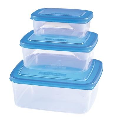 Sada 3 ks čtvercových plastových dóz, v různých barvách. Malá dóza: rozměr 13,5x13,5 cm, objem 0,6 l střední dóza: rozměr 16,5x16,5 cm, objem 1 l velká dóza: rozměr 19,5x19,5 cm , objem 1,8 l