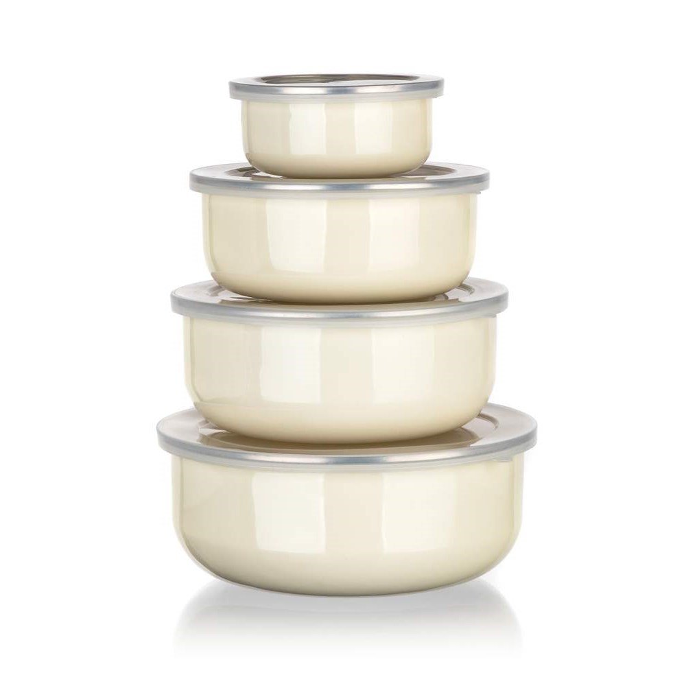 8dílná sada smaltovaných misek AMANDE s plastovými víčky o průměrů 10, 14, 16 a 18 cm. Misky jsou určeny pouze pro uchovávání potravin, nejsou určeny na vaření.
