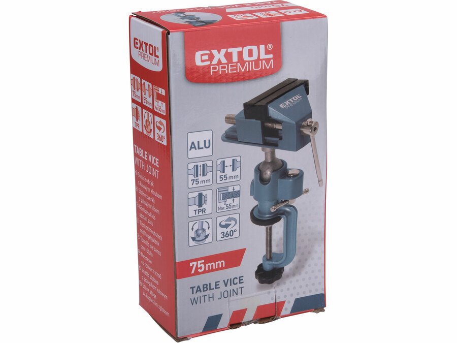 tělo svěráku je vyrobeno z hliníku a čelisti jsou opatřeny odnímatelnými pryžovými krytkami kloub s fixací dovoluje nastavení téměř ve všech směrech parametry: 75mm rozevření čelistí až 55mm rozsah upínacího klipu na stůl až 55mm