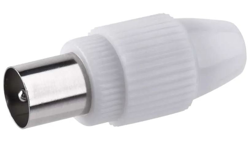 IEC konektor vidlice je určen k napojení na koaxiální kabel. Bílá barva